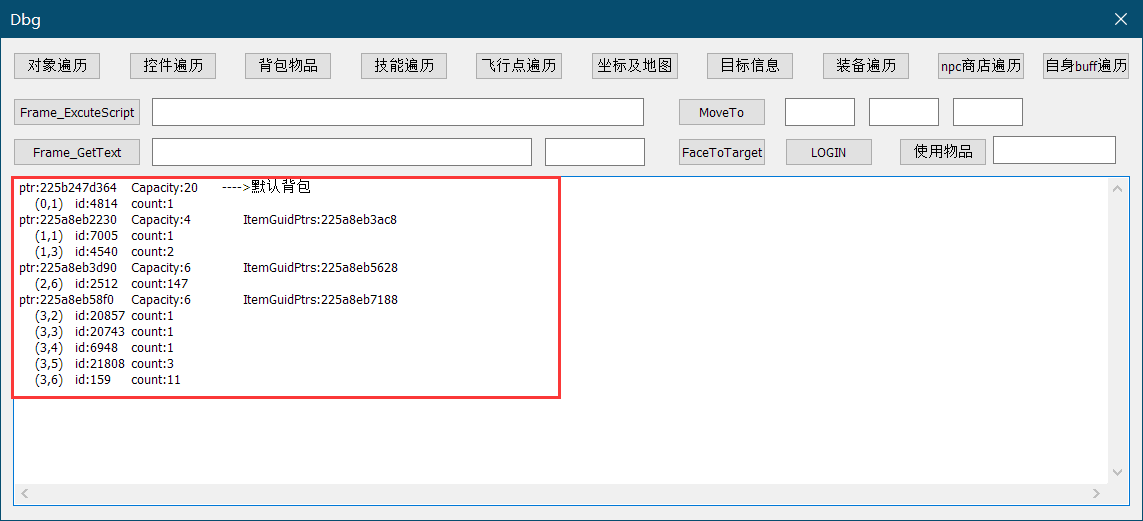 Loading... # 一、背包及背包物品遍历 通过相关API及IDA静态分析,定位如下函数 ```c/c++ bool __fastcall sub_14171E500(__int64 a1, int a2, _QWORD *a3, int *a4, _DWORD *a5) { __int64 v8; // rdi __int64 localPlayerPtr; // rax bool v10; // cc int v12; // eax int v13; // eax int v14; // eax __int64 bagPtr; // rax unsigned __int128 bagGUID; // [rsp+20h] [rbp-18h] BYREF *a3 = 0i64; *a4 = -1; v8 = (int)a1; *a5 = 2; sub_1410E0EE0(a1); if ( !localPlayerPtr ) // localPlayerPtr 实际为sub_1410E0EE0(a1)返回值 return 0; *a4 = a2; if ( (int)v8 >= 0 ) { if ( (int)v8 >= 11 ) return *a3 && *a4 >= 0 && *a4 < *(_DWORD *)*a3; bagGUID = (unsigned int)v8 < 0xB && ((int)v8 < 4 || sub_141252550()) ? *((_OWORD *)&unk_142FA0450 + v8) : (unsigned __int128)0i64; bagPtr = ((__int64 (__fastcall *)(_QWORD, _QWORD, _QWORD, _QWORD))ObjGUID2Ptr)( &bagGUID, 4i64, "D:\\BuildServer\\WoW\\1\\work\\DedicatedCheckout\\Classic\\Source\\Ui\\ContainerFrame.cpp", 614i64); if ( bagPtr ) *a3 = (*(__int64 (__fastcall **)(__int64))(*(_QWORD *)bagPtr + 0x350i64))(bagPtr); if ( (int)v8 < 4 ) return *a3 && *a4 >= 0 && *a4 < *(_DWORD *)*a3; goto LABEL_23; } *a3 = localPlayerPtr + 0x28640; // item-guid数组指针 switch ( (_DWORD)v8 ) { case 0xFFFFFFFB: v14 = *a4 + 0x4B; *a4 = v14; v10 = v14 <= 81; break; case 0xFFFFFFFD: v13 = *a4 + 0x5E; *a4 = v13; v10 = v13 <= 125; break; case 0xFFFFFFFE: v12 = *a4 + 0x2F; *a4 = v12; if ( v12 > 74 ) return 0; LABEL_23: *a5 = 3; return *a3 && *a4 >= 0 && *a4 < *(_DWORD *)*a3; case 0xFFFFFFFF: *a4 += 0x17; v10 = *a4 <= (int)(sub_1412544D0(*a3) + 23); break; default: return *a3 && *a4 >= 0 && *a4 < *(_DWORD *)*a3; } if ( !v10 ) return 0; return *a3 && *a4 >= 0 && *a4 < *(_DWORD *)*a3; } ``` 根据上述伪代码,大胆猜测: 1. `&unk_142FA0450 + v8`为背包指针或者GUID; 2. `*a3 = (*(__int64 (__fastcall **)(__int64))(*(_QWORD *)bagPtr + 0x350i64))(bagPtr)`与背包中物品有关系。 通过Cheat Engine验证,发现: 1. `&unk_142FA0450 + bagIndex`为背包GUID。 2. 虚函数:`bagPtr + 0x350`为`lea rax, qword ptr ds:[rcx+0x00001730]`,观察 `bagPtr+0x1730`处值,发现`*(bagPtr+0x1730+8)`为背包物品GUID数组。 考虑到游戏存在系统自带背包,在上述伪代码中,背包物品指针为`localPlayerPtr + 0x28640` 因此,有了如下遍历函数: ```c++ void DbgWin::OnBnClickedButton3() { // TODO: 在此添加控件通知处理程序代码 std::string str = ""; for (auto i = -1; i < 5; i++) { if (utils::read<DWORD64>(g_ModuleHandle + offset::BagGUID + i * 16) == 0) //背包为空 { if (i == -1) //系统自带背包 { DWORD64 playerAddr = getLocalPlayerPtr(); auto ptr = utils::read<DWORD64>(playerAddr + 0x28648); str += "ptr:" + utils::ptr2str(ptr)+"\tCapacity:20 ---->默认背包\r\n"; for (int j = 0; j < 20; j++) { if (utils::read<DWORD64>(ptr + (j + 23) * 16) == 0) //物品为空 continue; auto ItemPtr = guid2ptr((char*)(ptr + (j + 23) * 16)); //背包ptr auto pDescript = utils::read<DWORD64>(ItemPtr + offset::StorageField); auto id = utils::read<DWORD64>(pDescript + offset::ItemID); auto count = utils::read<DWORD64>(pDescript + offset::ItemStackCount); str += " (" + std::to_string(i + 1) + "," + std::to_string(j + 1) + ")\tid:" + std::to_string(id) + "\tcount:" + std::to_string(count) + "\r\n"; } } continue; } auto ptr = guid2ptr((char*)(g_ModuleHandle + offset::BagGUID + i * 16)); //背包ptr str+="ptr:"+ utils::ptr2str(ptr) ; auto size = utils::read<uint32_t>(ptr + offset::BagItemOffset + offset::BagItemsCapacity); auto itemguidptr = utils::read<DWORD64>(ptr + offset::BagItemOffset + offset::BagItemGUIDOffset); str += "\tCapacity:" + std::to_string(size) +"\tItemGuidPtrs:"+ utils::ptr2str(itemguidptr)+ "\r\n"; for (auto j = 0; j < size; j++) { if (utils::read<DWORD64>(itemguidptr + j * 16) == 0) //物品为空 continue; auto ItemPtr = guid2ptr((char*)(itemguidptr + j * 16)); //背包ptr auto pDescript = utils::read<DWORD64>(ItemPtr + offset::StorageField); auto id = utils::read<DWORD64>(pDescript + offset::ItemID); auto count = utils::read<DWORD64>(pDescript + offset::ItemStackCount); str += " (" + std::to_string(i+1)+"," + std::to_string(j + 1)+")\tid:" + std::to_string(id) +"\tcount:" + std::to_string(count) + "\r\n"; } } SetDlgItemText(IDC_EDIT1, str.c_str()); } ``` 运行效果如下图所示:  # 二、装备物品遍历 由于人物只能佩戴19件装备,有了如下遍历。 ```c++ void DbgWin::OnBnClickedButton8() { // TODO: 在此添加控件通知处理程序代码 DWORD64 playerAddr = getLocalPlayerPtr(); auto ptr = utils::read<DWORD64>(playerAddr + 0x28648); std::string str = "ptr:" + utils::ptr2str(ptr) + "\r\n"; for (int i = 0; i < 19; i++) { char guid[128] = "\0"; g_Func_guid2Str((unsigned char*)(ptr + i * 16), guid, 128);//游戏guid转str函数 str += "ptr:" + utils::ptr2str(ptr + i * 16)+"\tindex:" + std::to_string(i+1) + "\tguid:" + std::string(guid) + "\r\n"; } SetDlgItemText(IDC_EDIT1, str.c_str()); } ``` 其效果如下图所示:  # 三、buff、debuf遍历 ```c++ void DbgWin::OnBnClickedButton15() { // TODO: 在此添加控件通知处理程序代码 DWORD64 playerAddr = getLocalPlayerPtr(); auto count = utils::read<DWORD>(playerAddr + offset::AuraCount1); std::string str = ""; for (int i = 0; i < count; i++) { auto aruaID = utils::read<DWORD>(playerAddr + i * offset::AuraSize + offset::AuraTable1 + offset::AuraSpellId); auto timeLeft = utils::read<DWORD>(playerAddr + i * offset::AuraSize + offset::AuraTable1 + offset::AuraTimeLeft); auto flags = utils::read<UINT16>(playerAddr + i * offset::AuraSize + offset::AuraTable1 + offset::AuraFlags); auto lv = utils::read<UINT16>(playerAddr + i * offset::AuraSize + offset::AuraTable1 + offset::AuraLevel); char guid[128] = "\0"; g_Func_guid2Str((unsigned char*)(playerAddr + i * offset::AuraSize + offset::AuraTable1 + offset::AuraOwnerGUID), guid, 128); if(aruaID!=0) str += "ID:" + std::to_string(aruaID) + "\ttimeLeft:" + std::to_string(timeLeft) + "\tflags:" + std::to_string(flags) + "\tlv:" + st